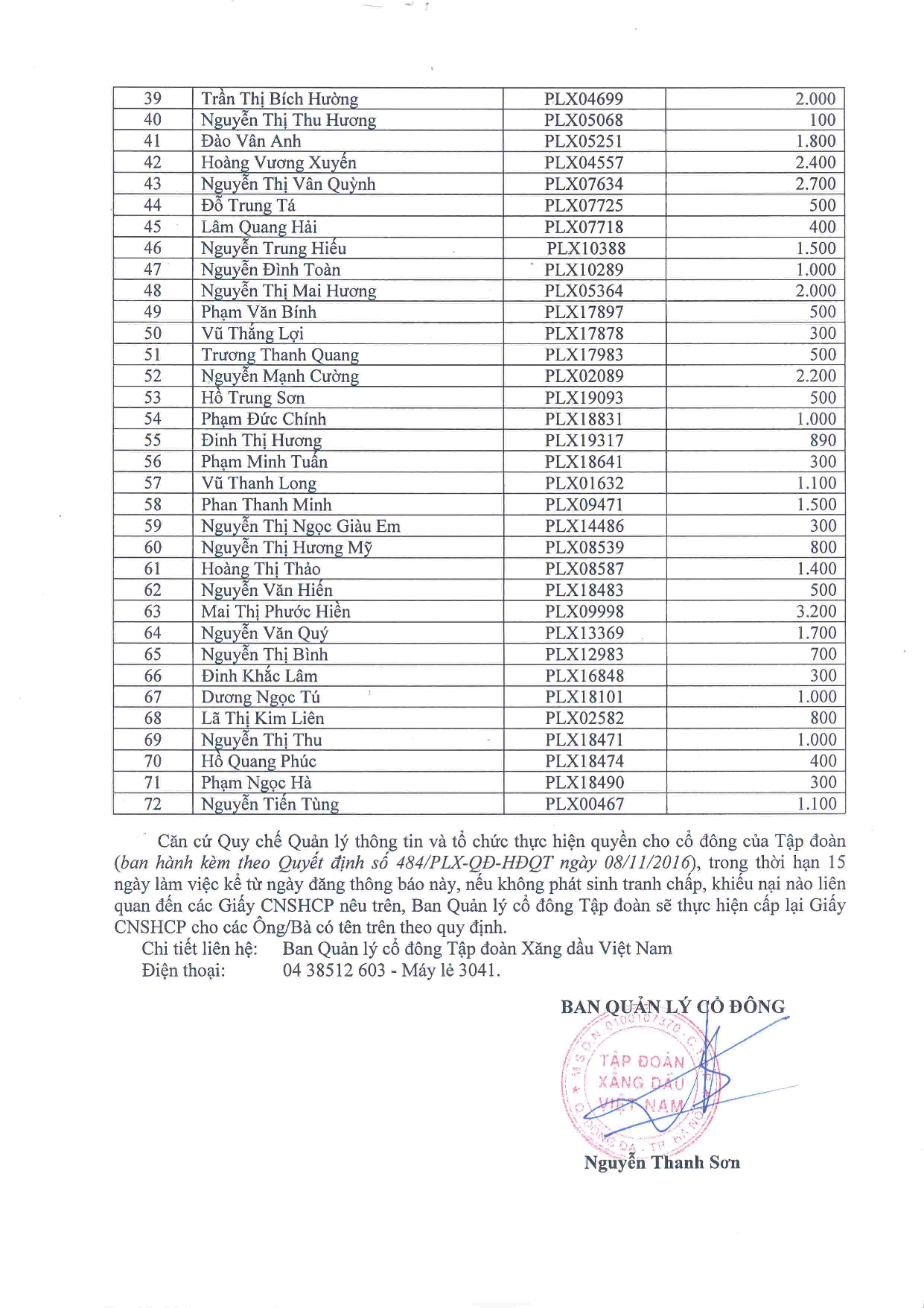Danh sách chi tiết tạiThông báosố 010/2017/PLX-TB-BQLCĐ ngày 22.3.2017và các mẫu Đơn đề nghị cấp lại GCNSHCP & Giấy đề nghị hiệu chỉnh thông tin - để Quý vị Cổ đông thuận tiện trong tra cứu, sử dụng.